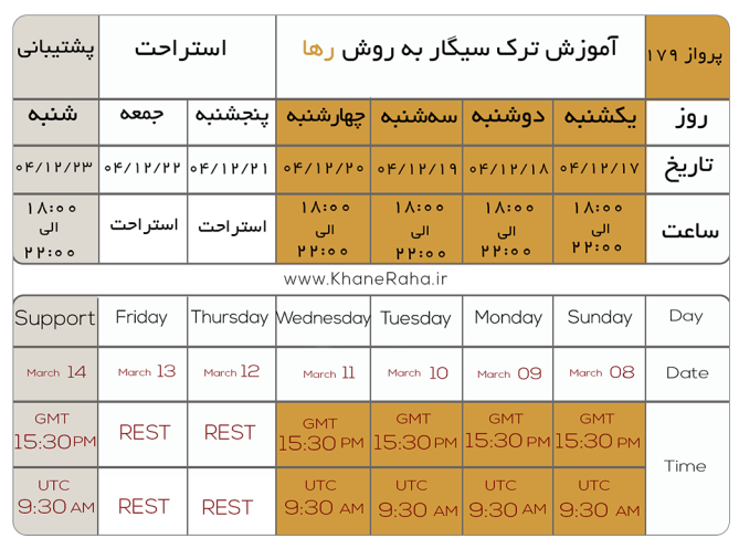 شرایط ابطال ضمانت نامه: حضور به موقع در تمام روزهای دوره رها طبق جدول بالا جهت موفقیت شما الزامی است و در صورت تاخیر و یا غیبت و یا مصرف مواد مخدردیگر،رها هیچ مسئولیتی در مقابل ضمانت نامه و ترک سیگار شما نخواهد داشت.